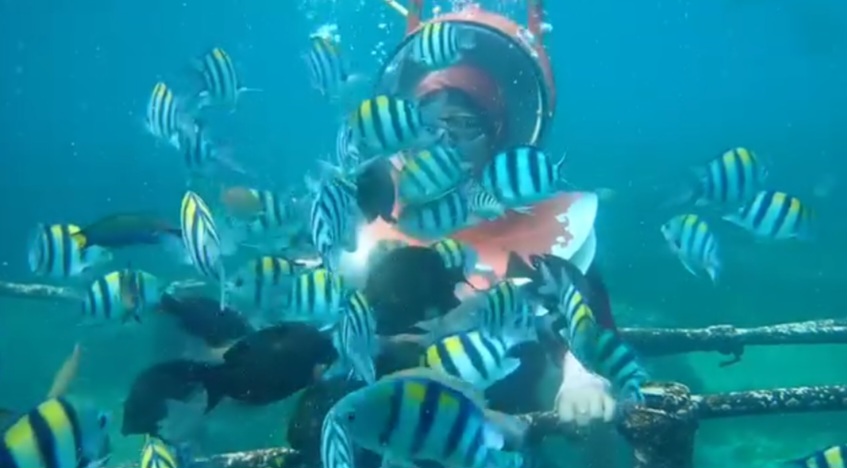 Yuhuuu… ini wahana yang bikin hati happy. Nggak banyak effort, tapi kita bisa melihat keindahan bawah laut. Nggak perlu bisa menyelam atau berenang untuk menikmati keindahan bawah laut. Dengan helm khusus berisi oksigen, wisatawan bisa berjalan di dasar laut sambil memberi makan ikan-ikan berwarna-warni. Cocok untuk anak-anak hingga orang dewasa.