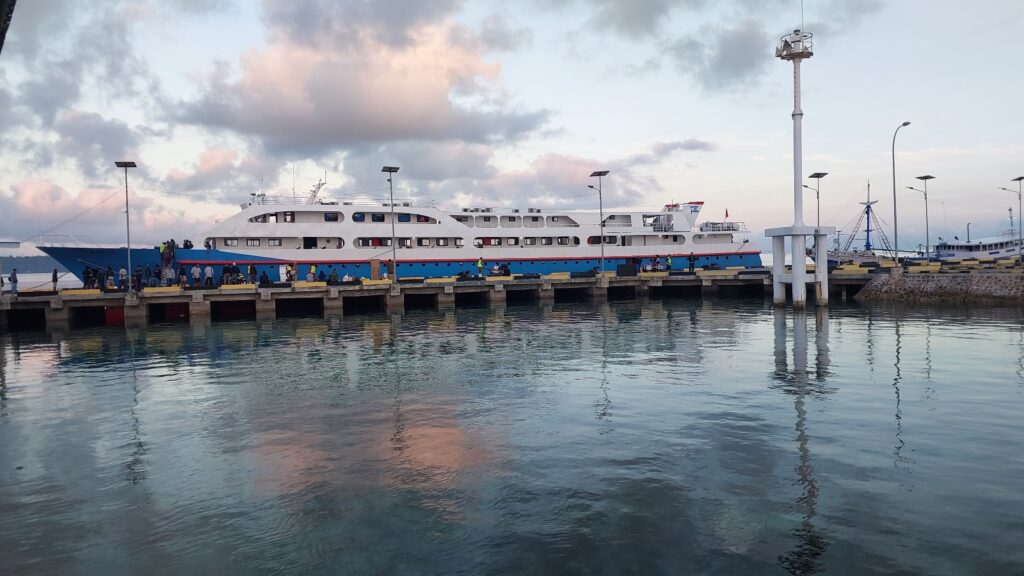 Nyenyak betul saya tidur, sampai nggak dengar lagi langkah orang lalu lalang. Saya dibangunin Pak Ode jelang kapal sandar. Katanya kalau sudah dibagi teh, berarti sudah mau sampai. Oh bagus juga dikasih teh panas biar melek. Saya njur bebersih, sholat Shubuh, dan balik lagi ke tempat. Sekitar 05.30 WITA (keesokan harinya) barulah kapal sampai di pelabuhan Wakatobi.