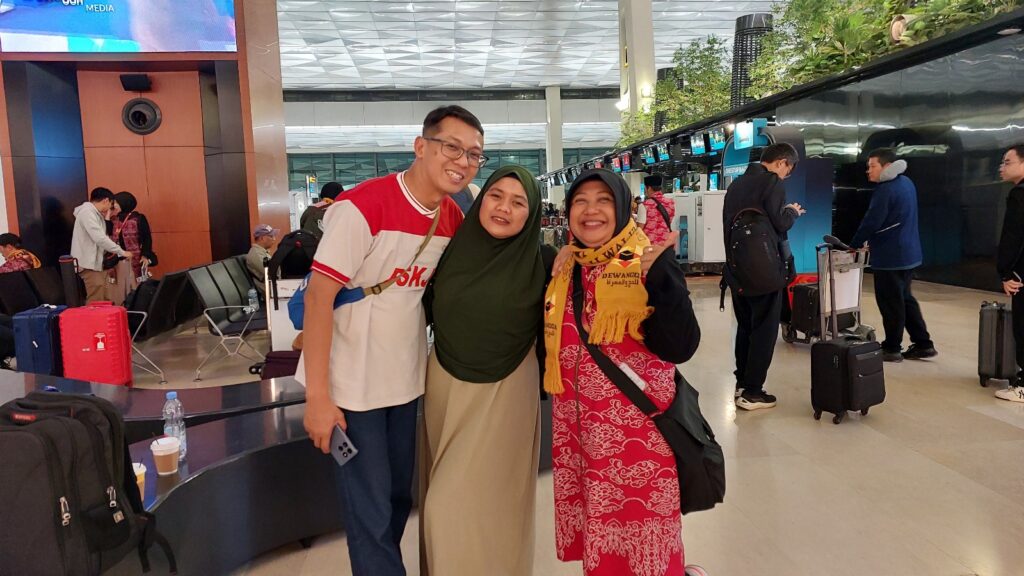 Bersama adik lelaki dan ipar saya di Bandara Soetta, Jakarta. Dokumentasi Ari Kinoysan Wulandari.