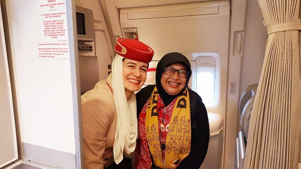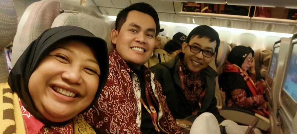 Saya, Mas Donni (Mas Dokter), Mas Indra di Emirates untuk penerbangan Jakarta Dubai. Dokumentasi Ari Kinoysan Wulandari.