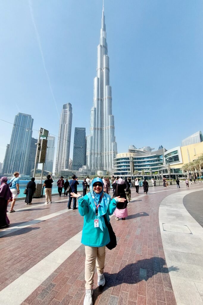 Lepas dari aquarium raksasa, kami masuk ke ikonik Dubai. Gedung pencakar langit yang sangat tinggi. Lupa saya tingginya berapa ratus meter. Yang jelas gedung-gedung di Dubai itu sekarang jadi gedung-gedung tertinggi nomor satu di dunia; wes ngalah-ngalahin gedung-gedung tinggi di Beijing. Kalau China penakluk kemustahilan (telur, beras bae China bisa bikin tiruan yang seenak aslinya), maka Dubai boleh disebut sebagai penakluk ketinggian.😁