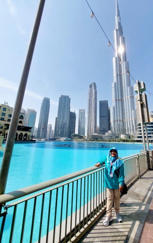 Di sini ada juga kolam buatan yang berwarna hijau tosca cantik diterpa sinar matahari di siang bolong. Hadeuh, saya merasa nyesel salah pilih warna baju karena warnanya setipe dengan warna air aquarium raksasa dan warna air kolam. Nah kolam ini kalau bahasa kampung saya disebut dengan embung 😁 ya tapi embung-nya Dubai dibandingkan dengan embung Nglanggeran atau embung Potorono di sekitaran rumah saya, jelas beda jauh… Gengsinya itu lho…. begitu kata ipar saya 😅