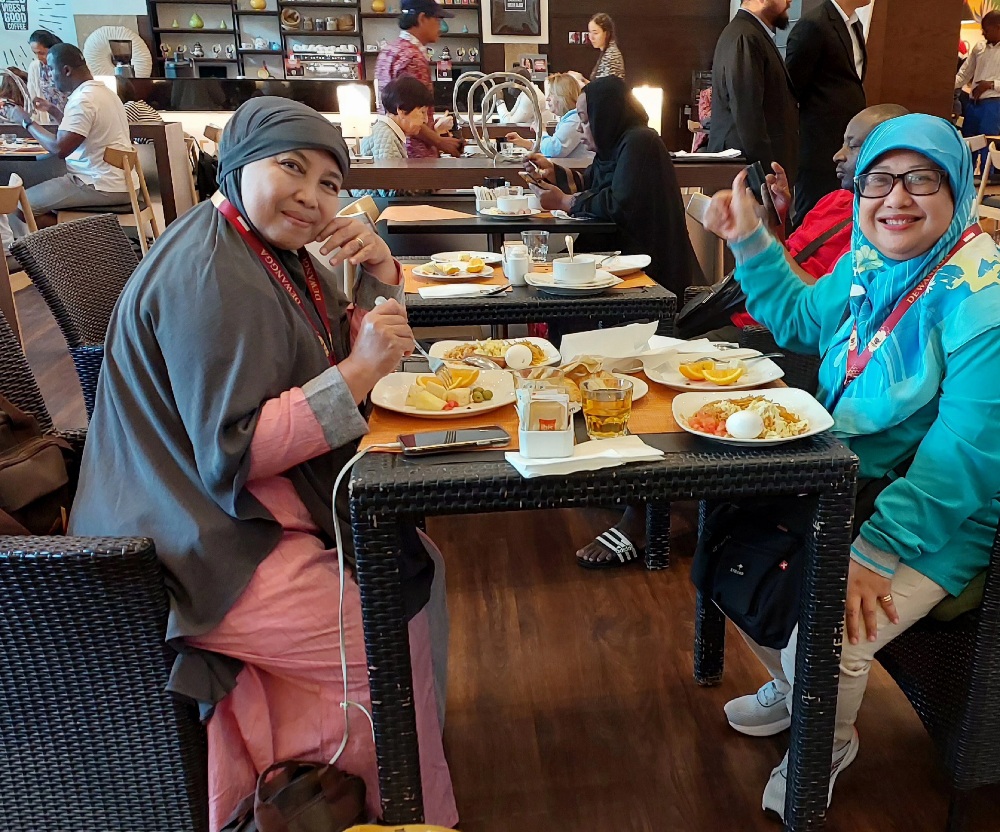 Saya dengan Bu Yuli sarapan di hotel Ibis, Dubai. Dokumentasi Ari Kinoysan Wulandari.