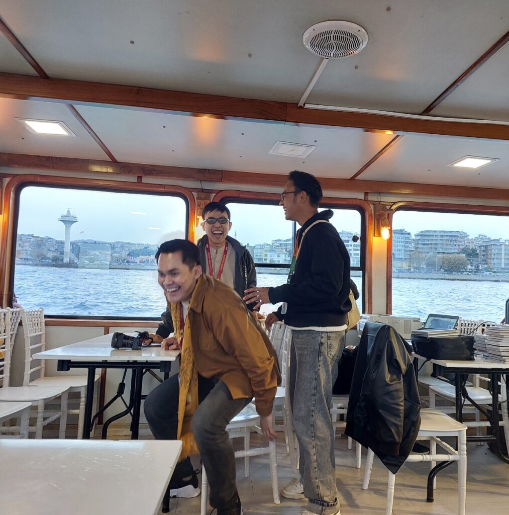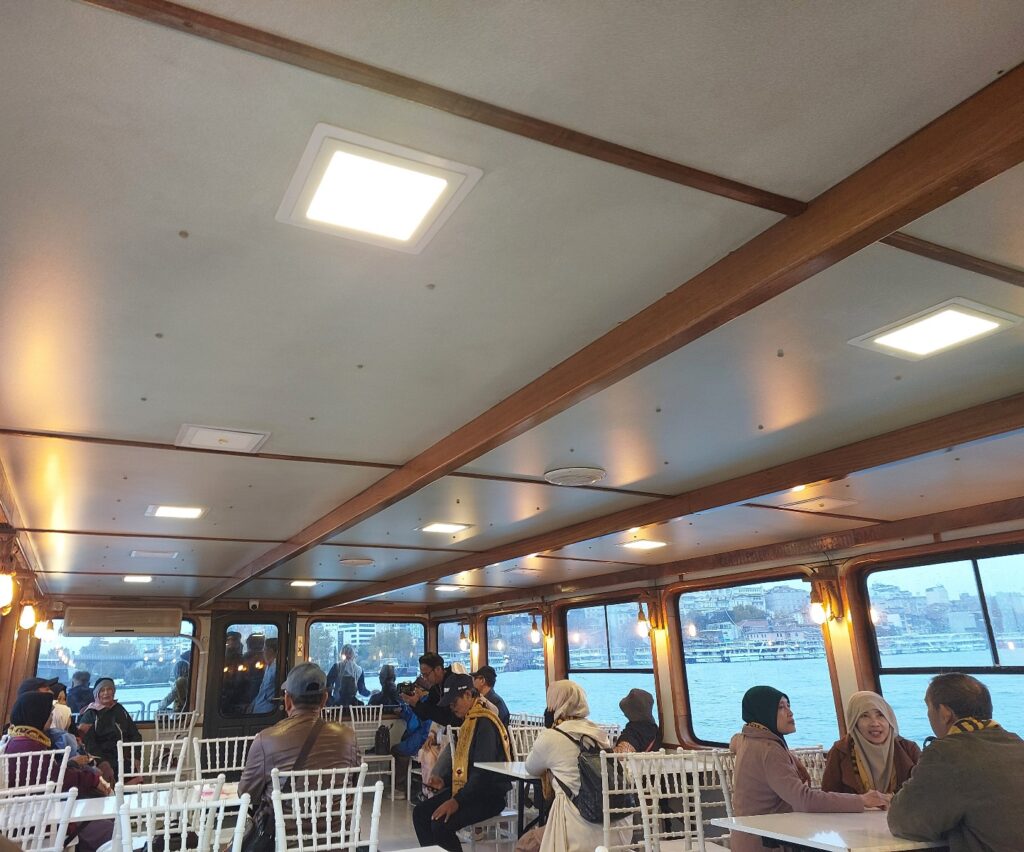 Di seberang sisi kanan saya ada Mas Donni dan Mas Indra. Entah mereka berdua heboh cerita apa dengan Mas Issam, si fotografer di Turki sampai ketawa lepas begitu. Saya lebih fokus ke pemandangan di luar jendela kapal dan tentu nggak nyimak obrolan mereka. Saya juga nggak terlalu perhatian pada aktivitas orang-orang saat itu. Kayaknya ya biasa saja. Foto-foto, makan-makan, ngobrol, ngelamun, balesin WA, dll.
