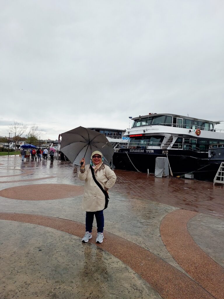 Ada gunanya juga saya bawa payung. Areal kapal sandar, Bosphorus. Dokumentasi Ari Kinoysan Wulandari.