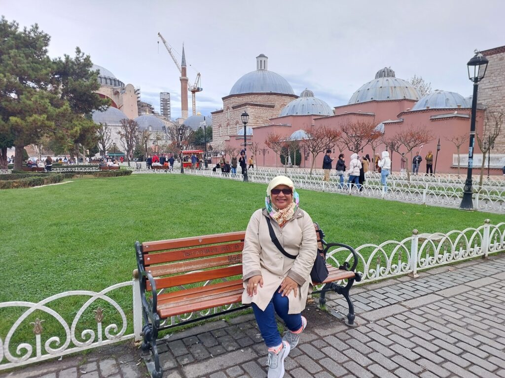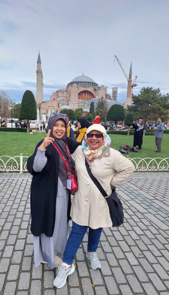 Saya dan Bu Yuli di areal taman, sisi lain, Hagia Sophia. Dokumentasi Ari Kinoysan Wulandari.