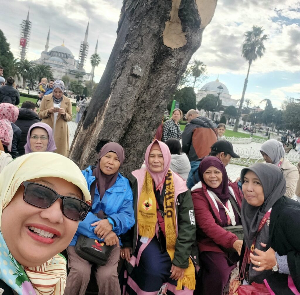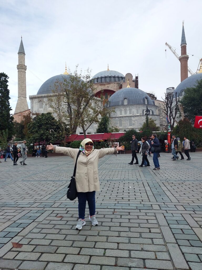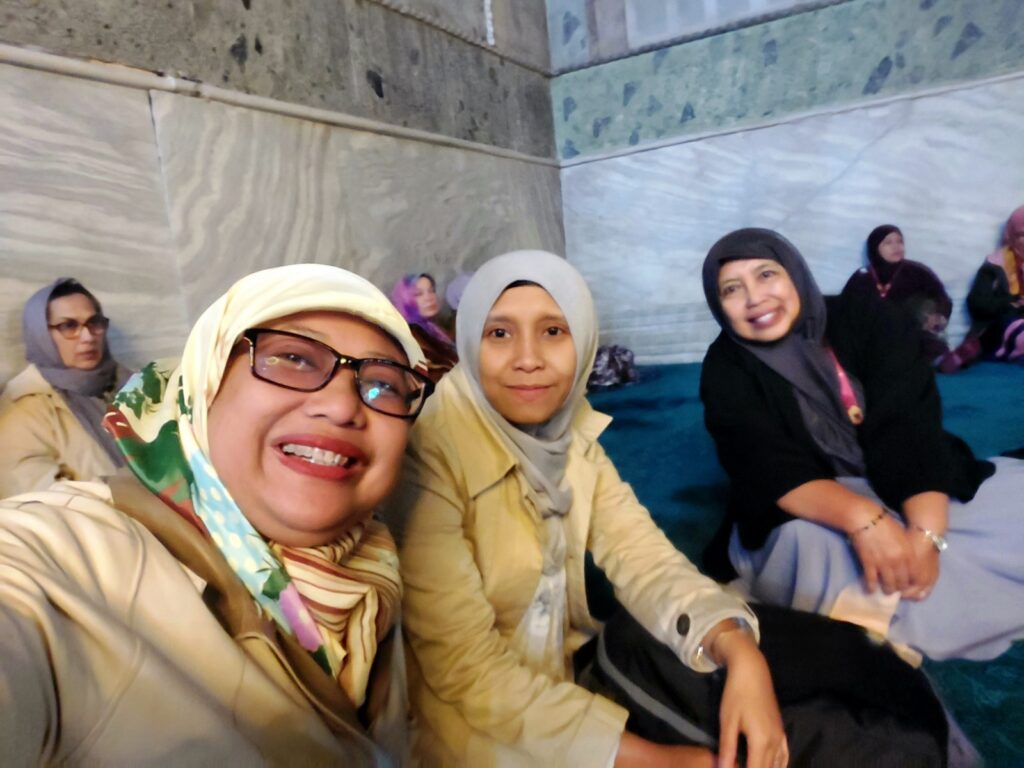 Saya, Bu Sida, Bu Yuli di areal dalam mesjid agung, Hagia Sophia. Dokumentasi Ari Kinoysan Wulandari.