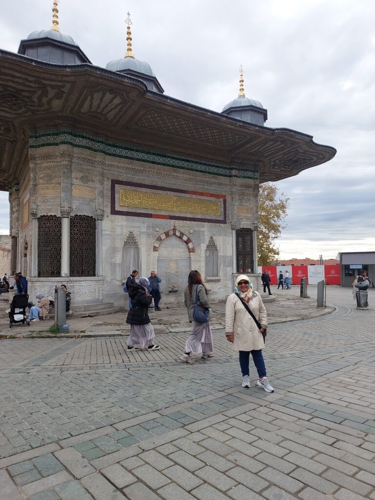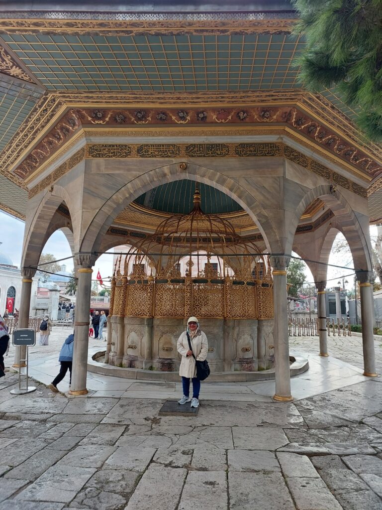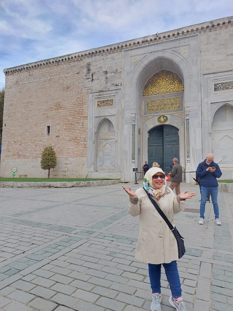 Jadi di sini saya catatkan dari berbagai referensi tentang Istana Topkapi. Tempat ini hanya 3–5 menit berjalan kaki dari lokasi saya berada. Iya, sebuah gerbang megah dengan ukiran emas tampak di depan: Bab-ı Hümayun, gerbang kekaisaran menuju Istana Topkapi, istana pertama Dinasti Ottoman setelah penaklukan Konstantinopel. Konon, kalau memasuki kompleks ini seperti memasuki dunia Sultan Mehmed Sang Penakluk: hening, luas, dan penuh simbol kekuasaan.