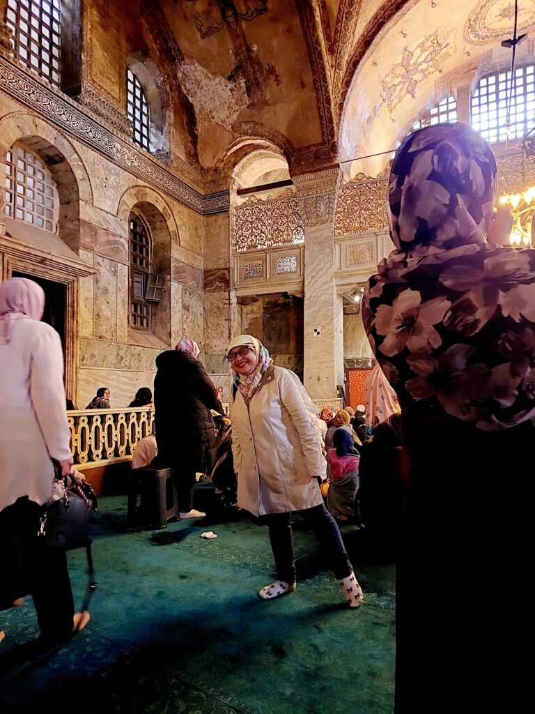 Antrean wisatawan semakin ramai, tapi suasananya tetap tenang. Cahaya matahari memantul lembut di kubah emas, membuatnya tampak menyala dari dalam.Masuk ke dalam Hagia Sophia terasa seperti memasuki dunia lain; karena ada beberapa hal.
