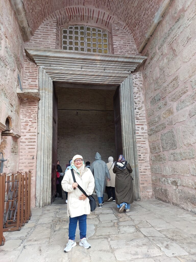 Saya di pintu masuk dan tempat wudu di mesjid agung Hagia Sophia. Dokumentasi Ari Kinoysan Wulandari.