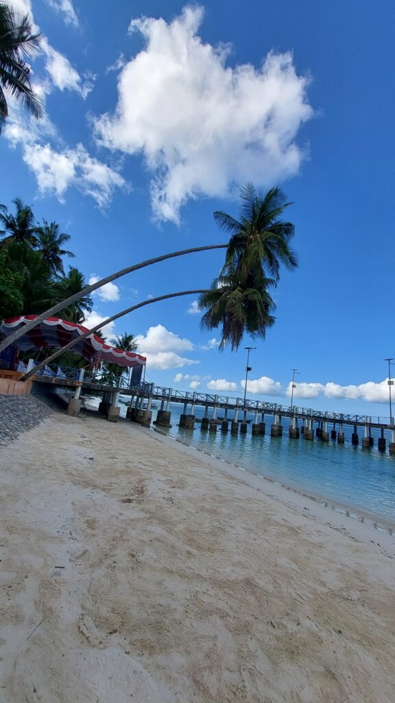 Suasananya tenang dan bersih, dikelilingi oleh pepohonan kelapa dan vegetasi hijau tropis yang menambah kesan damai. Angin laut yang lembut membuat siapa pun betah berlama-lama di sini; entah hanya berjalan di tepi pantai, duduk menikmati ombak, atau sekadar mendengarkan desir angin di antara daun kelapa.
