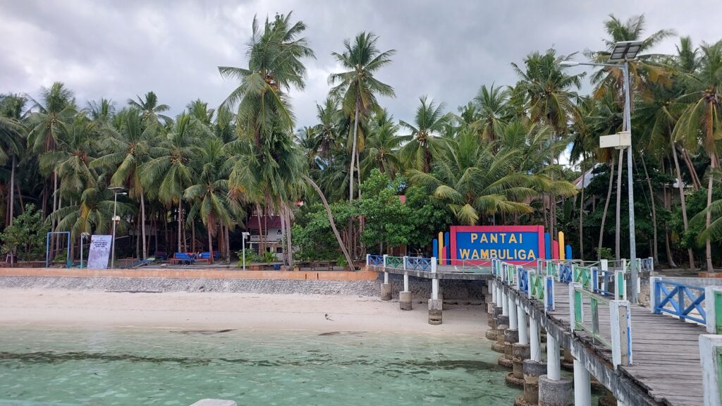 Keempat, Pantai Wambuliga. Pantai ini masih alami dan jarang tersentuh wisata massal. Pantai ini dikenal karena suasananya yang tenang serta keindahan alam yang masih murni. Pantai Wambuliga memiliki hamparan pasir putih yang lembut dan air laut yang jernih bergradasi dari biru muda hingga biru tua. Di beberapa bagian, terlihat karang-karang kecil yang muncul saat air laut surut. Pemandangan lautnya sangat memanjakan mata.