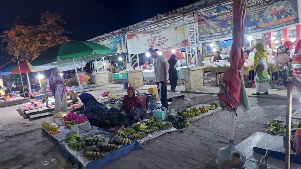 Setiap kali Pak Ode bilang apa saja malam itu, sebenarnya saya wes nggak terlalu mudeng. Otak saya wes cenderung “tidur” daripada memikirkan hal lain. Toh saya masih cukup melek untuk melihat dan memperhatikan bahwa areal pasar ini cukup besar dan luas. Isi barang dagangan pun kayaknya cukup lengkap. Mulai dari sayur mayur, bumbu bumbu dapur, hingga buah-buahan. Ada pula aneka jajanan dan masakan tradisional, aneka jualan minuman dan es.