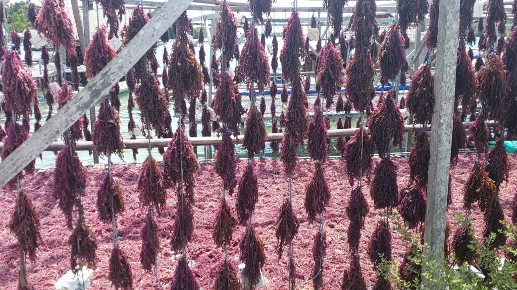 Warga Liya Bahari sudah turun-temurun membudidayakan rumput laut berwarna merah. Saya cek-cek ini jenis spesies Eucheuma cottonii (cmiiw). Rumput laut ini dijemur sampai kering di pinggir pantai dan dijual sebagai bahan baku kosmetik, makanan, hingga obat-obatan.