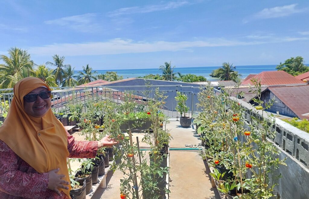 Tanaman hidroponik di rumah Bu Tuti. Di seberang sana terlihat laut biru. Dokumentasi Ari Kinoysan Wulandari.