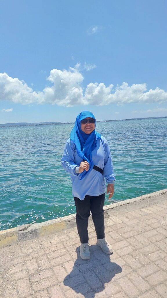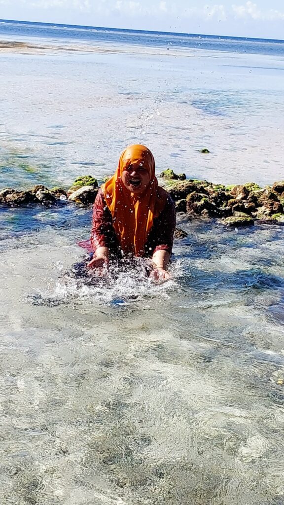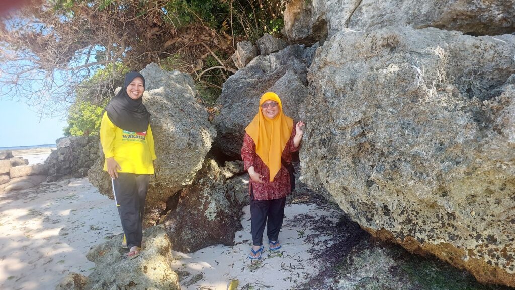 Saya dengan Bu Tuti di bebatuan pantai areal sumber mata air seratus. Dokumentasi Ari Kinoysan Wulandari.