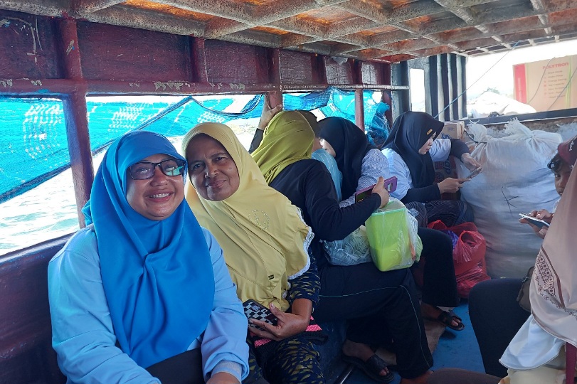 Saya dan Bu Muna di perahu motor dengan penumpang lain dan barang belanjaannya. Dokumentasi Ari Kinoysan Wulandari.