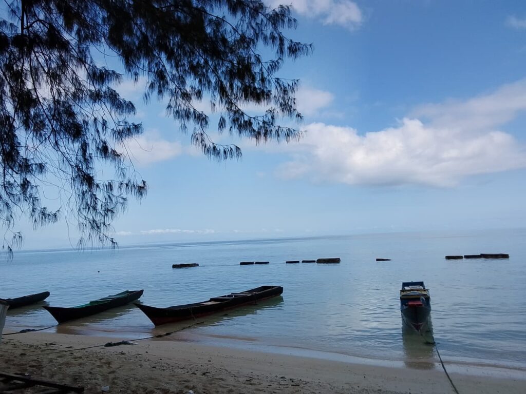 Pantai Wambuliga. Di sini ada basecamp layanan snorkeling dan diving. Dokumentasi Ari Kinoysan Wulandari.