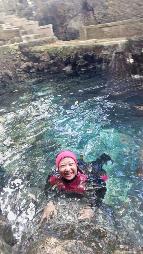 Ada 3 sumber mata air besar di situ. Tempat pertama paling kecil, paling dangkal meskipun kedalaman bagian tengah ya 2 meteran, tapi kiri kanannya sumber air banyak batu besar untuk duduk-duduk dan pegangan. Tempat ini isinya cenderung anak-anak kecil dan ibunya yang mengawasi.