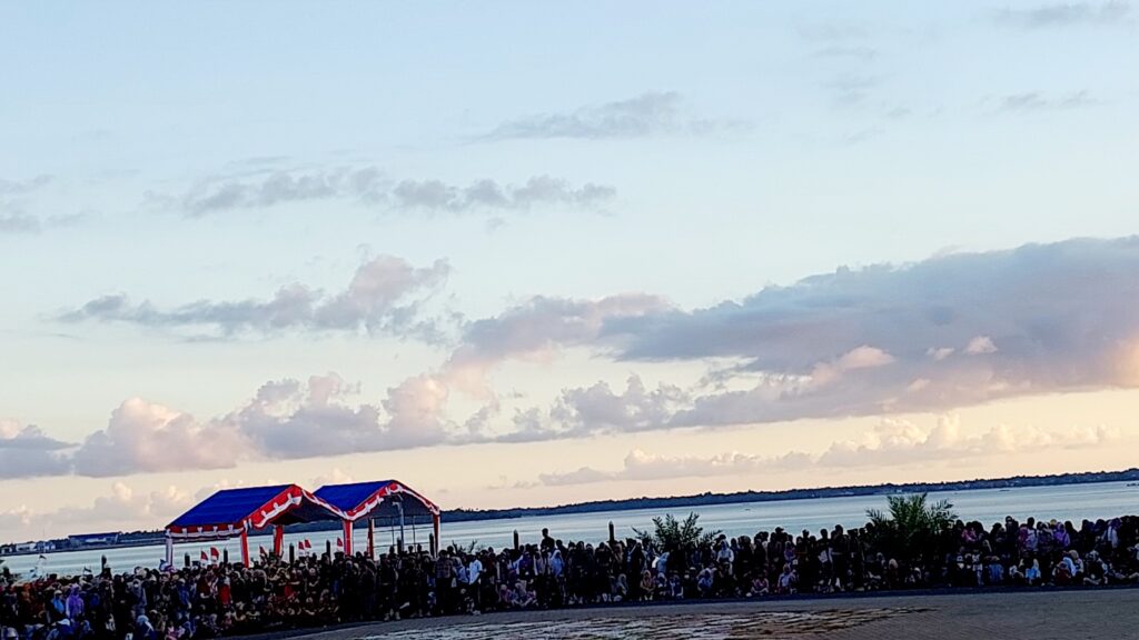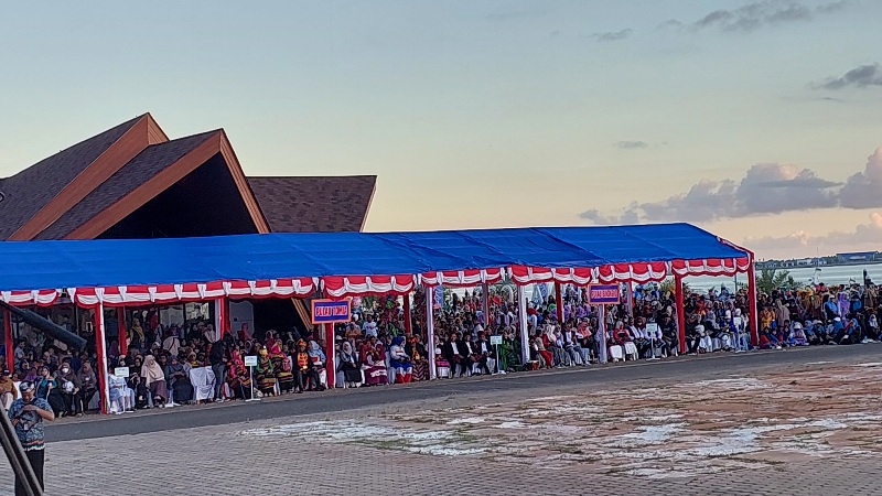 Saya melihat di semua sisi yang disediakan tempat untuk warga wes penuh. Termasuk kursi-kursi untuk mereka warga undangan atau perwakilan. Saya berhitung cepat, mereka yang ada di kursi kursi itu dari jumlah deret ke samping dan ke belakang, pasti lebih dari 200 orang. Kalau ada 4 sisi yang ada di lapangan ini, yach lebih kurang 800-900an orang. Belum lagi jumlah tamu undangan dan pejabat-pejabat di panggung utama; mungkin sekitar 80-100 an orang. Ya lebih kurang 1000 an orang (cmiiw) di siang bolong itu yang sudah memenuhi areal Marina Togo atau Maritime Center ini.